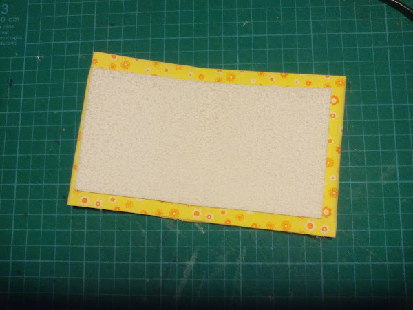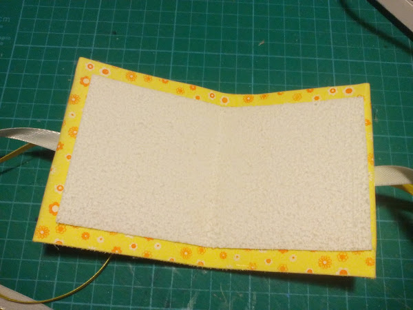 8. Con ayuda de dos cartones de 8 * 8 cm y un trozo de goma eva estampada de 10 * 32 cm corn el que cortaremos como si de un libro se tratara. También usaremos un resto de goma eva toalla de 8 * 15 cm y formaremos un librito porta agujas.
