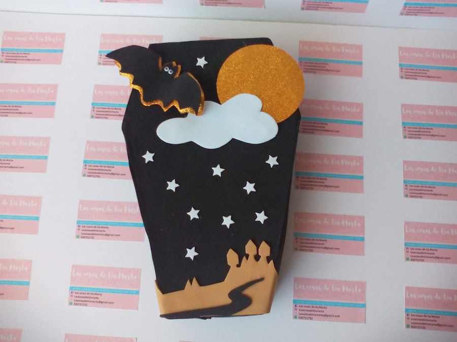 8. Pegamos cada una de las piezas y damos volumen alguna de ellas con ayuda de la plancha. Ya tenemos nuestro dulcero listo para llenarlo de chuches. ¿Verdad que ha quedado muy original?.