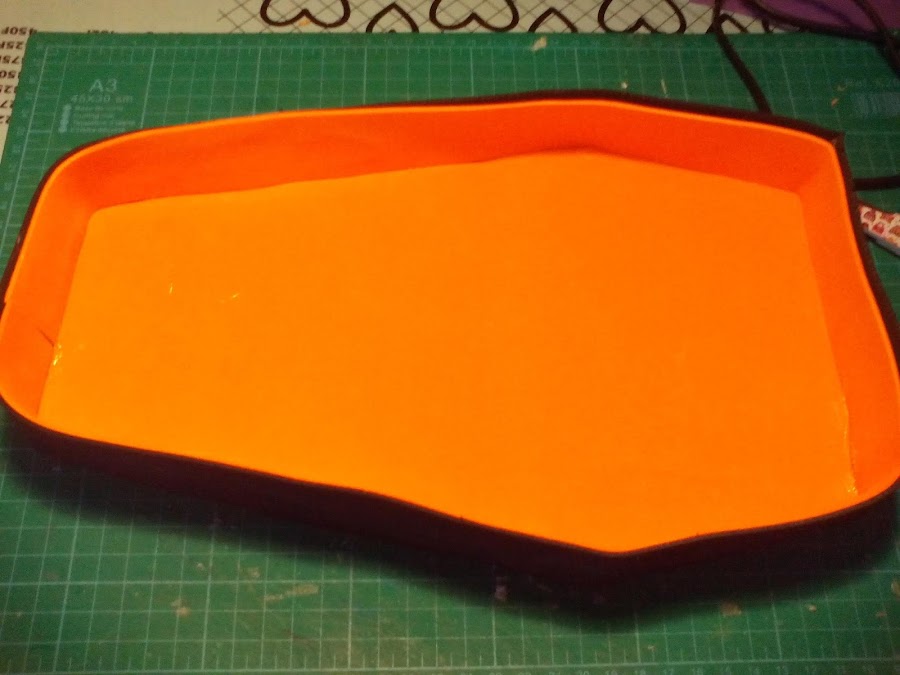 6. Repetimos los pasos anteriores, forramos de negro el exterior y de naranja el interior. Después con solo una tira negra en este caso hacemos el contorno de la tapa.