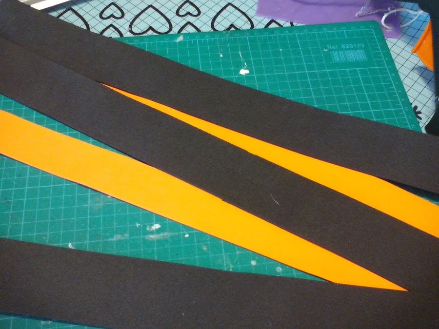 3. También cortamos varias tiras de goma Eva la negra de 5 cm. de ancho y la naranja de 3 cm.