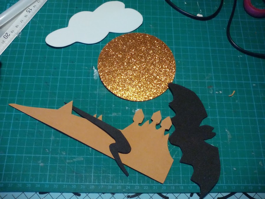 7. Ahora llega el momento de la decoración para darle ese pequeño toque terrorífico, para lo que utilizaremos trozos de goma Eva con los que he recreado un paisaje.