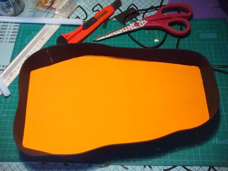 2. Cortamos dos piezas para forrar el cartón, una por dentro y otra por fuera, en mi caso negro y naranja.