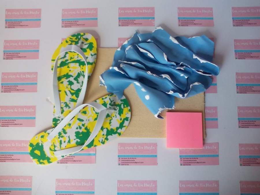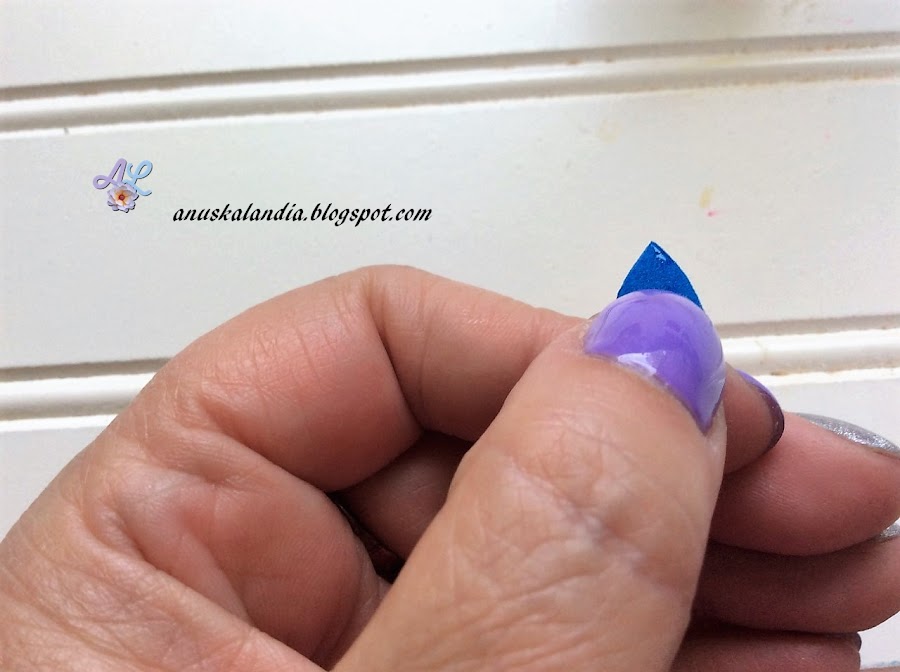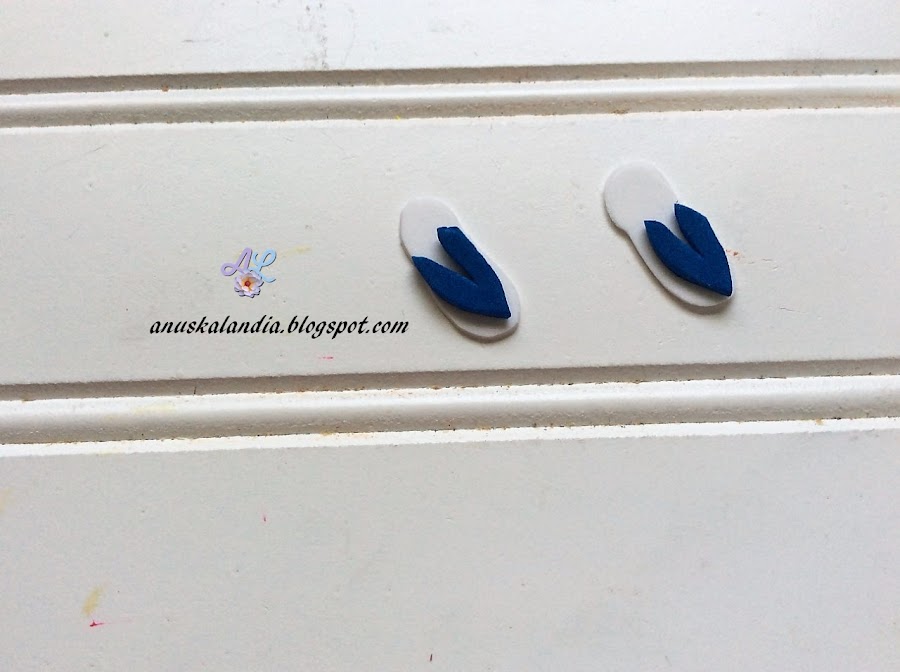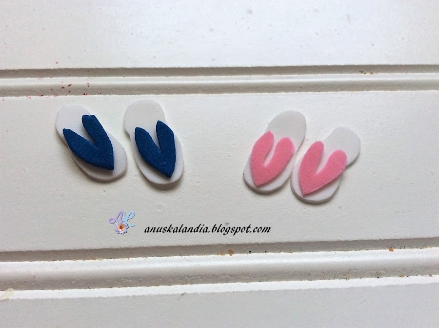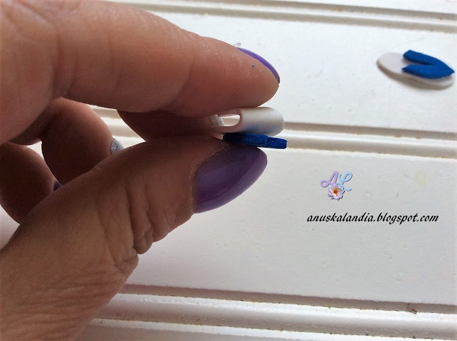 Cogemos las dos suelas blancas y las "V" del color que prefiramos. Superponemos para ver donde pegar. Gota de pegamento en la punta superior por detrás. Pegamos a la chancla. Para poner pegamento en la parte inferior, doblar la chancla como se ve en la imagen. Colocar gota y pegar.