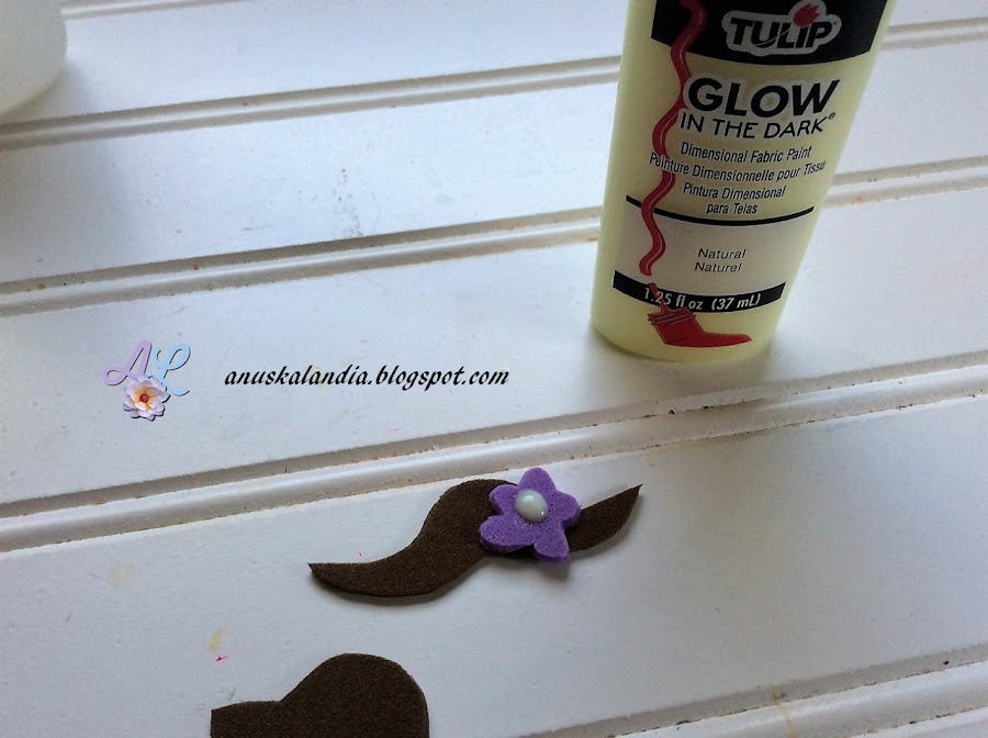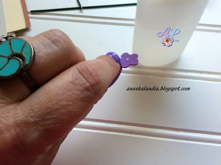 A uno le colocaremos una florecita. Ya comenzaremos a usar pegamento instantáneo. Gota en el centro y pegamos en un lado del sombrero. Además, cada flor, lleva una gota de nuestra querida pintura "Casper" (en algo hay que ir utilizándola, ¿no? jajajaja)