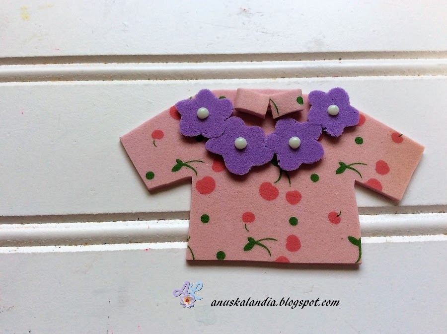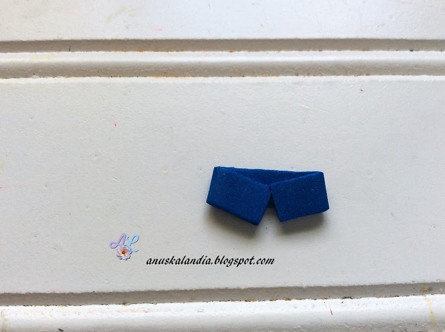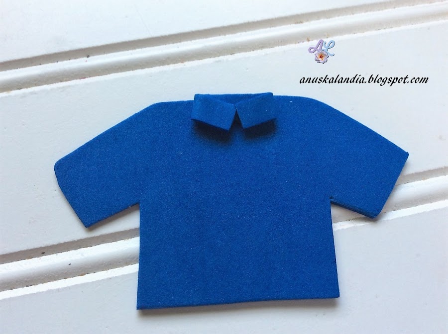 Doblamos por ambos lados la pieza del cuello, como se aprecia en las dos primeras imágenes. Ponemos una gota de pegamento en cada lado, por la parte interior. Pegamos como aparece en la cuarta foto. Gota en la parte posterior del cuello y pegar en el borde de la camisa. Pegamos cuatro flores para formar un collar. Pegamos de igual manera que la flor del sombrero y también le echamos su gota de "Casper"