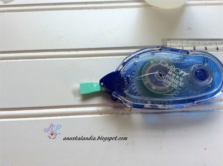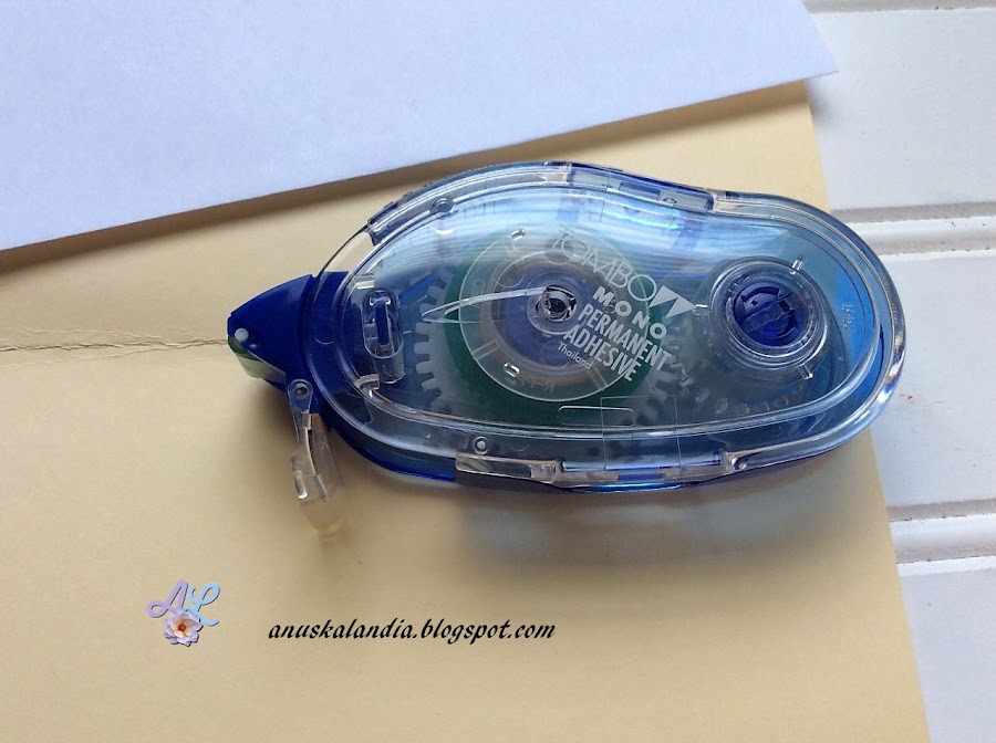 4.- Procederemos a pegar el papel interior a la cartulina. Vamos a utilizar el pegamento doble cara o "typex". Ponemos una tira como se aprecia en la imagen. Superponemos el papel encima de la cartulina. Presionamos. Cerramos la cartulina y hacemos presión por ambos lados para que se pegue. Nos quedará como en la última foto.