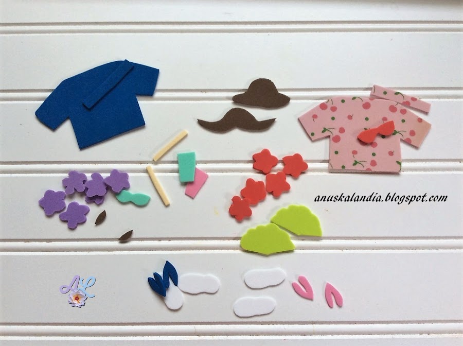 10.- Con las piezas encima de la tarjeta, las colocaremos y pegaremos según nuestro gusto y creatividad.