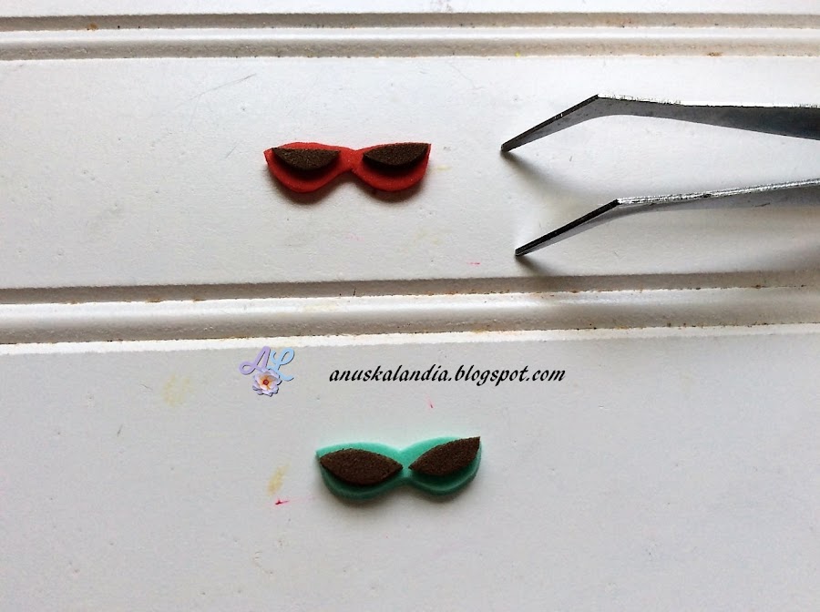- Gafas. Ponemos una gota de pegamento en cada lado y ponemos las piezas marrones o "cristales" encima, procurando que queden lo más derechas posibles. Yo he utilizado unas pinzas, porque las piezas son muy pequeñas.