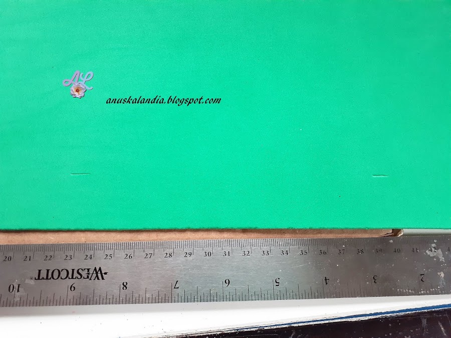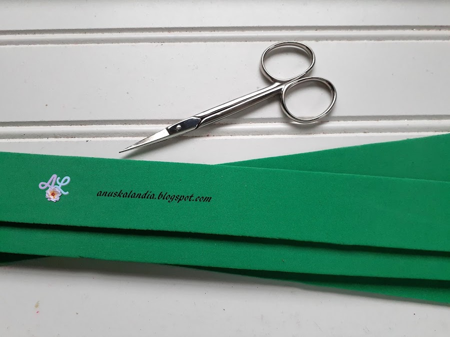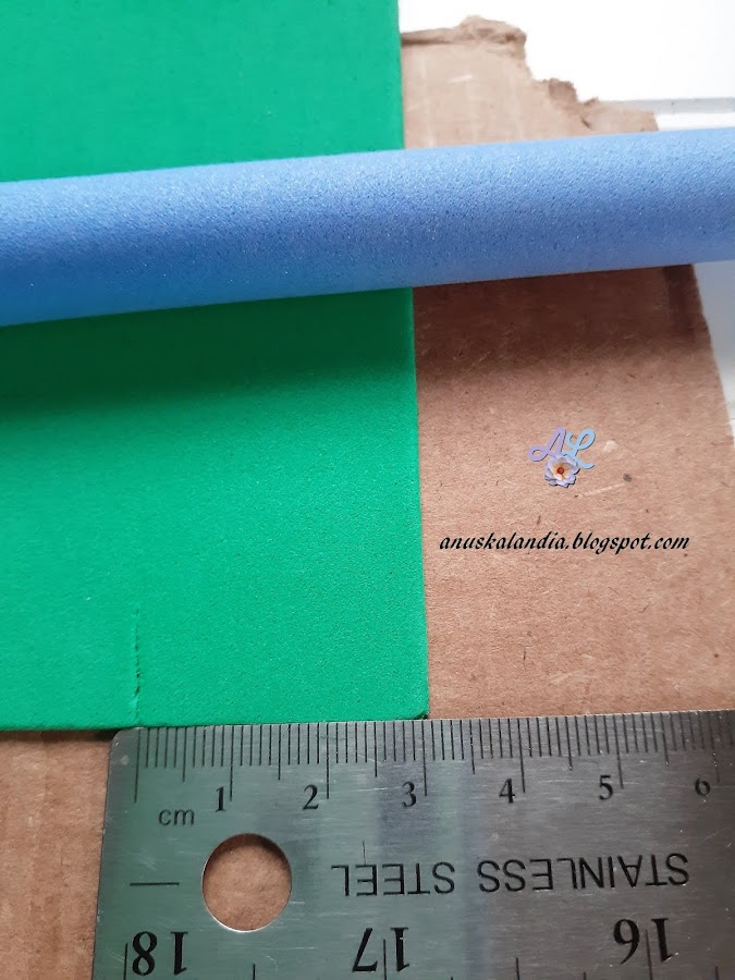1.- Tomamos la siguiente medida en la goma eva: 3 cm. de alto por el largo que tenga tu lámina de eva, en mi caso son 60 cm. Hacemos varias marcas para guiarnos y cortamos con cúter, para que el corte quede más limpio. Con estas medidas de cono y goma eva, yo he preparado 8 tiras.