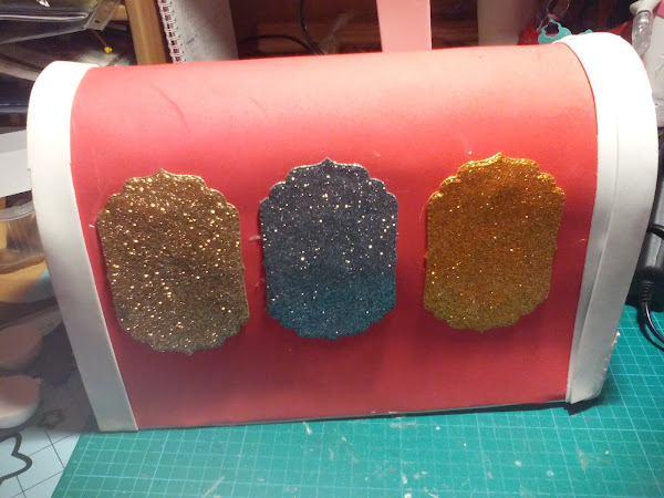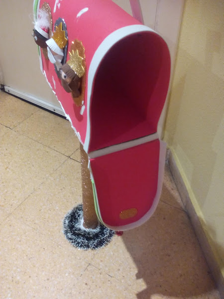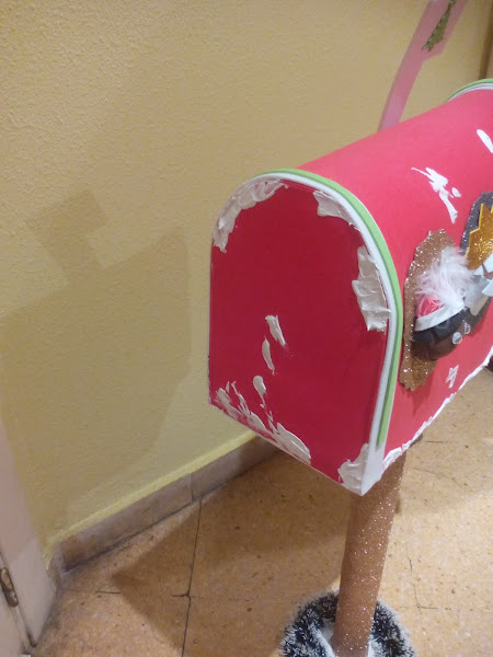 5. Poco a poco vamos a decorar nuestro buzón con chuches scraperas, goma Eva de purpurina...sin olvidarnos del tirador que indica que el buzón tiene correspondencia.