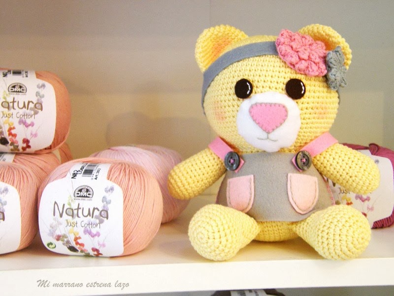 Está realizada con algodón, Natura, de la marca DMC, no les salen bolitas y son muy suaves, además hay muchos colores, por eso hay tantos Osos Amigurosos. La ropa está realizada con fieltro de lana 100% y los complementos también están realizados con el hilo Natura.