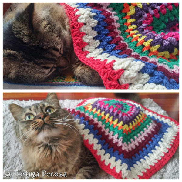 Recientemente he ampliado mis conocimientos en ganchillo y, he aprendido granny square. El resultado me gusta mucho. Y...como mi pecosa Mayi siempre me mira mientras hago crochet...pues decidí hacerle esta mantita que...le gusta muchisimo, en los dias de fresquete como hoy...se cobija bajo ella y echa las mejores de sus siestas.