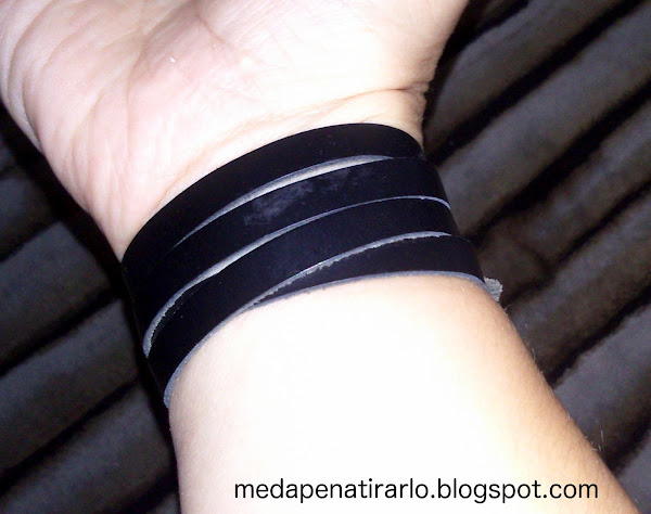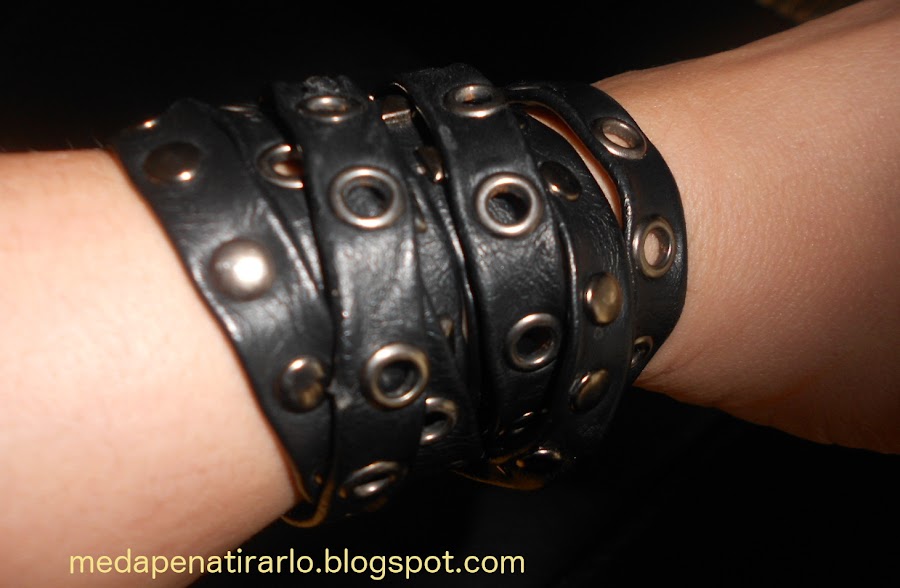 En esta ocasión la tira de cuero no viene de unos zapatos si no de un cinturón minúsculo de una falda de cuando yo tenía cuerpo de ponerme cosas con tan poca cintura. No hace falta tocarla un pelo, solo guardarla hasta que se te encienda la bombilla. Es una pulsera de cuero como tantas que ves en los mercadillos, pero gratis. De igual forma se puede usar de collar choker, que están muy de moda.