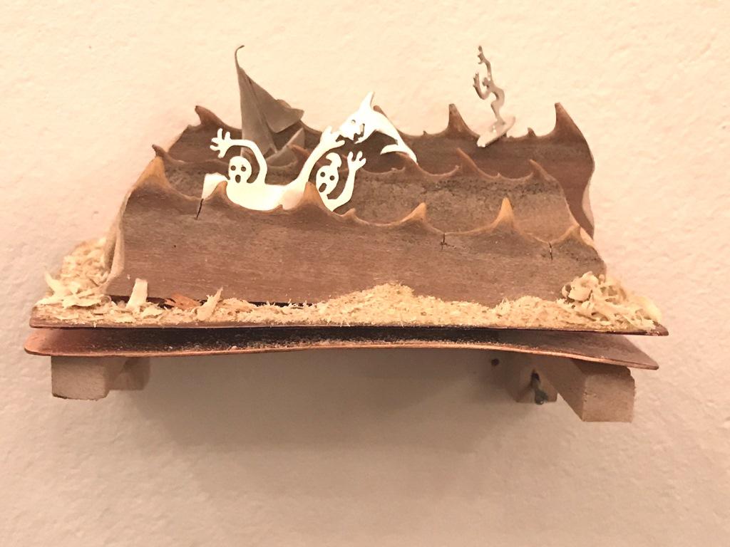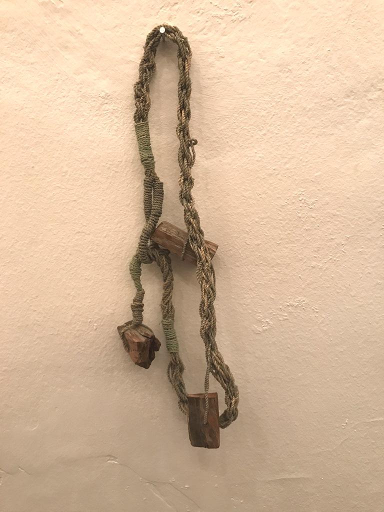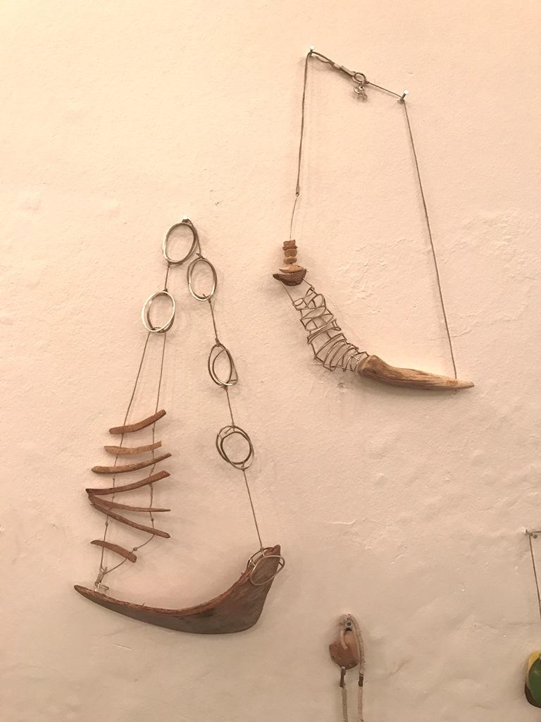 Maderas que aparecieron flotando en el océano pacífico, hilo de chaguar comprados en Humahuaca, en la provincia de Jujuy; papel prensado y esmaltado, hojas de palmeras que hacen las veces de joyas o de olas del mar que reciben visitas de personas y peces. Todo ayuda a la creatividad. Veamos de lo que estamos hablando: