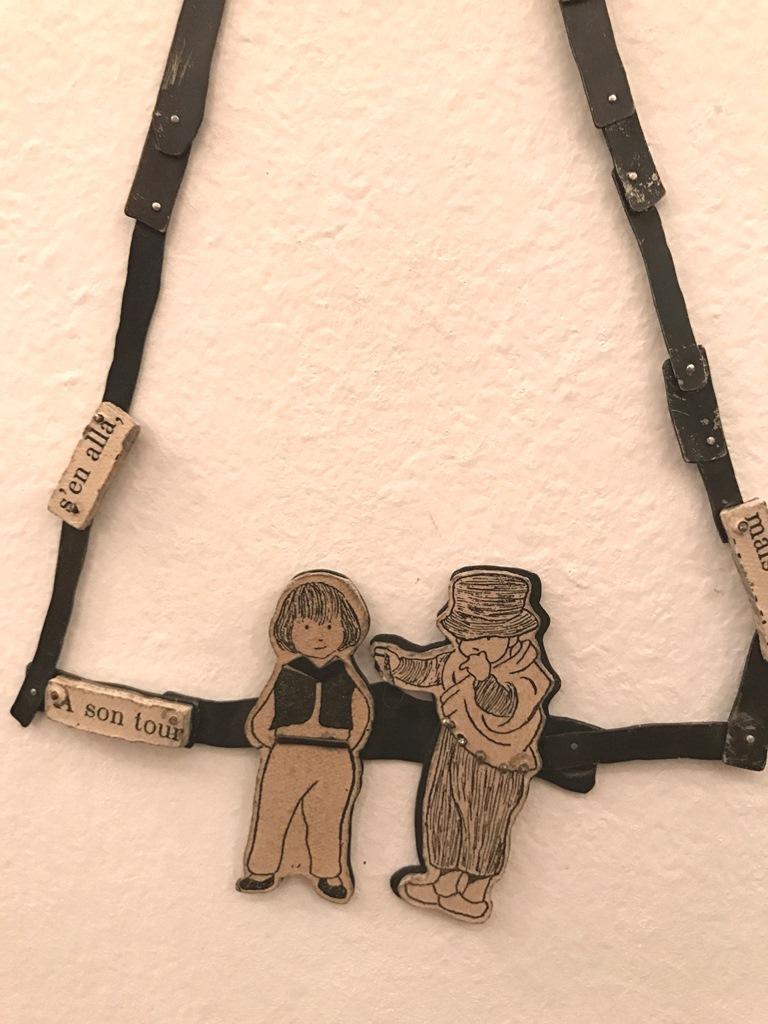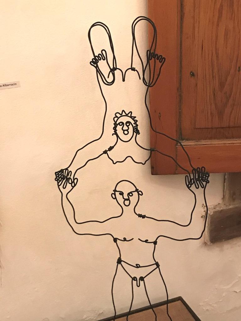 Los dúos de papel y madera, y las telas junto al oro estaban presentes en el salón. También unas esculturas de alambre llenas de humor, que te sacaban una sonrisa aunque hubieses ido sola a ver la Expo de Joyería Textil. Materiales como el cobre y el oro se entremezclaban con símbolos personales que vaya uno a saber qué significarían para el autor, aunque te daban ganas de pararlo y que se cuente qué pensaba cuando lo creaba, a quien rememoraba, a quien homenajeaba.