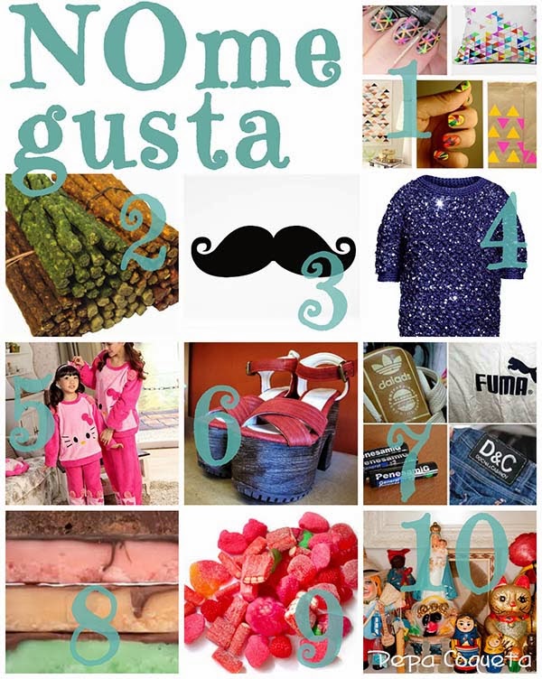 1. Las aristas y triángulos, no puedo con ellos. 2. Los colores "secos", esos que parece que les falta vida, no tiene nada que ver con los otoñales, son esos que no favorecen, que son rancios... 3. Los "moustache", no le veo la gracia. 4. Los brillos en exceso, no me refiero a un anillo de brillantes, claro, sino al abuso festivo, cursi o chabacano. 5. La ropa interior o pijamas con dibujos ¡¡me supera!! 6. Los taconazos vertiginosos, las plataformas desmesuradas, con lo bonito que es un tacón simplemente alto o un zapato plano, ¿no? 7. Las imitaciones o "se parece a", vamos que no. 8. El chocolate de sabores, con lo bueno que está el normal y con leche. 9. Las chuches no me han gustado jamás, vale, miento, alguna nube ya me como. 10. Y los atrapapolvos, figuritas inútiles o souvenirs, como mejor queráis llamarlos, no sirven para nada y dañan la vista.
