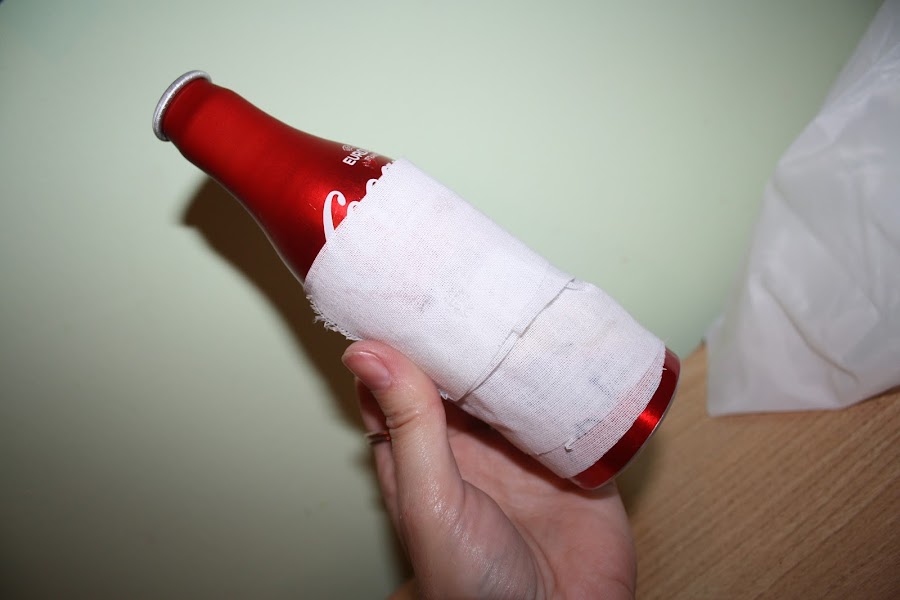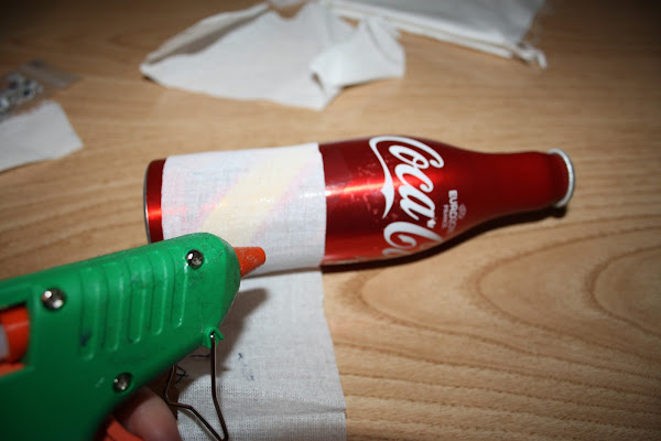 Situaremos una de las cintas alrededor de la botella y lo que haremos será pegar con la pistola la cinta sobre la misma cinta, de modo que el pegamento no entre en contacto con la botella. ¿Y esto por qué? pues porque el material de la misma es no poroso y no pegaría la cinta, y para eso tenemos que hacerlo como os indico.