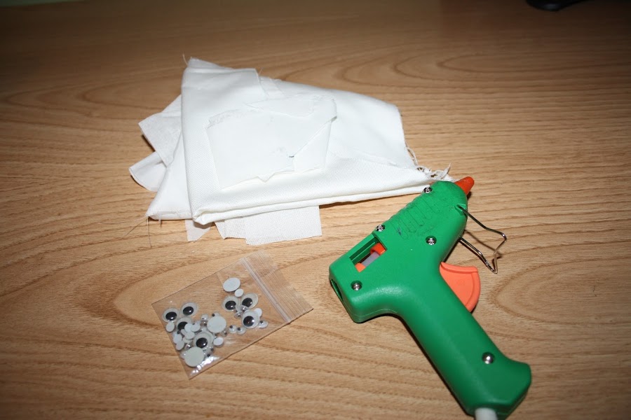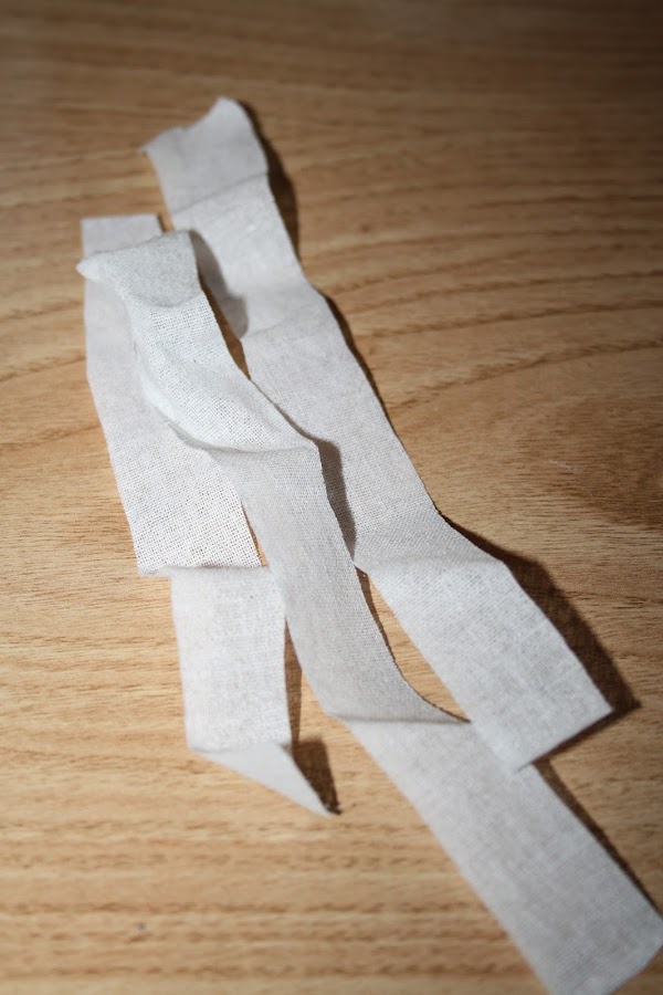Comenzamos por cortar tiras de la tela blanca de unos 2 centímetros de ancho y de 10 a 15 centímetros de largo. No os preocupéis si las tiras varían un poco de tamaño, lo importante es cortar varias para conseguir el efecto deseado.