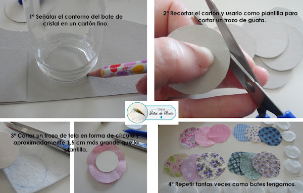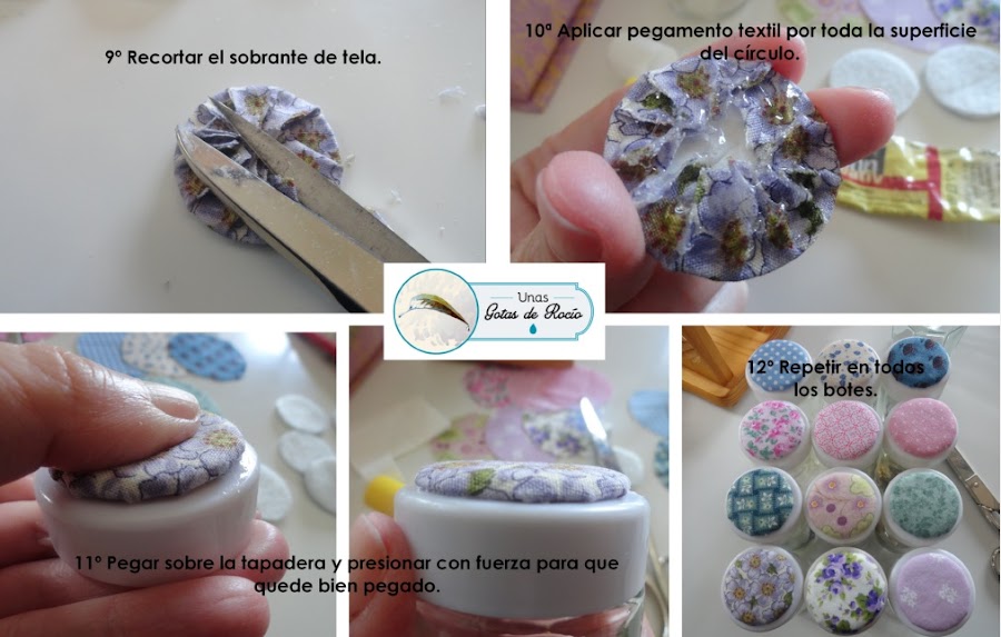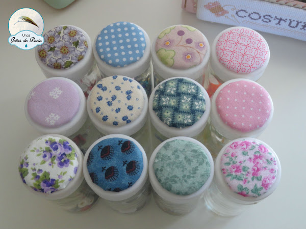 La tapadera de cada botecito va decorada con telas clasificadas por gamas cromáticas y dispuestas en el mismo orden (azules, verdes, malvas y rosas).