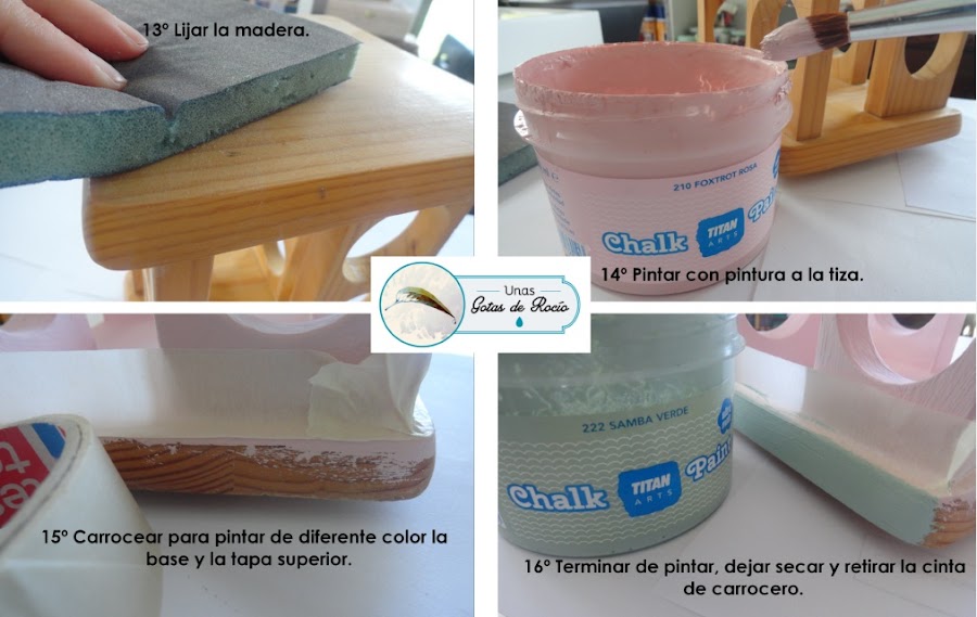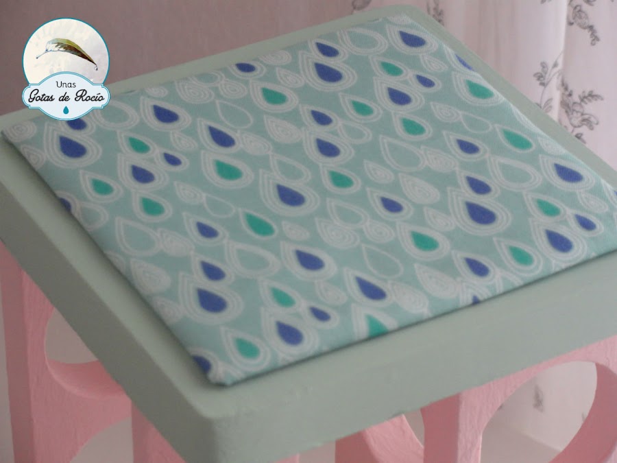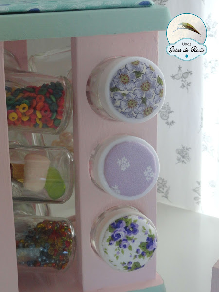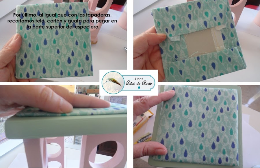 El especiero lo he pintado con pinturas a la tiza en dos colores (Verde Samba y Foxtrot Rosa). En la parte superior he colocado una tela que no sólo coordina en tono, sino en temática con mi blog, ¡¡y es que está llena de gotas: mis gotas de Rocío!!