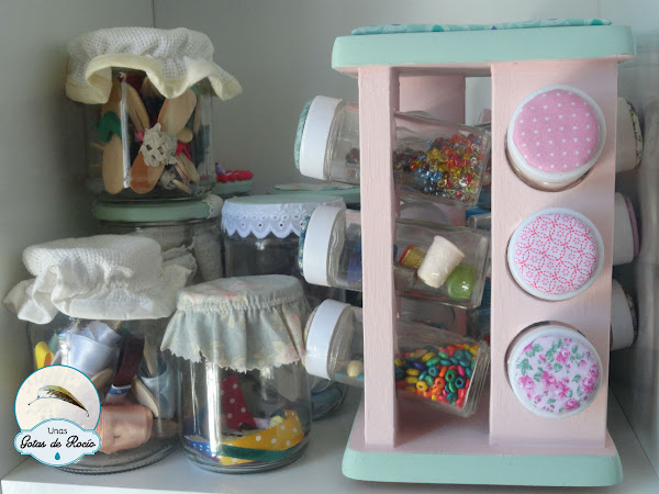 Tenía por casa y desde hace más de 10 años, un especiero que nunca usé como tal. Pero como no me gusta tirar por tirar y pienso que todo merece una segunda oportunidad, lo guardé en espera de que le llegara su momento. Y su momento llegó ayer sábado por la tarde, cuando me reservo un rato para disfrutar entre hilos, telas y últimamente pinturas a la tiza. Los doce botecitos para especias ahora son botecitos para botones, dedales, cuentas, y todos esos pequeños objetos de nuestro taller que no sabemos dónde guardar de manera ordenada y estética. Porque las cosas como son, bolsitas de plástico transparentes cumplen el mismo cometido, pero no llenan nuestra vista y nuestro espíritu.