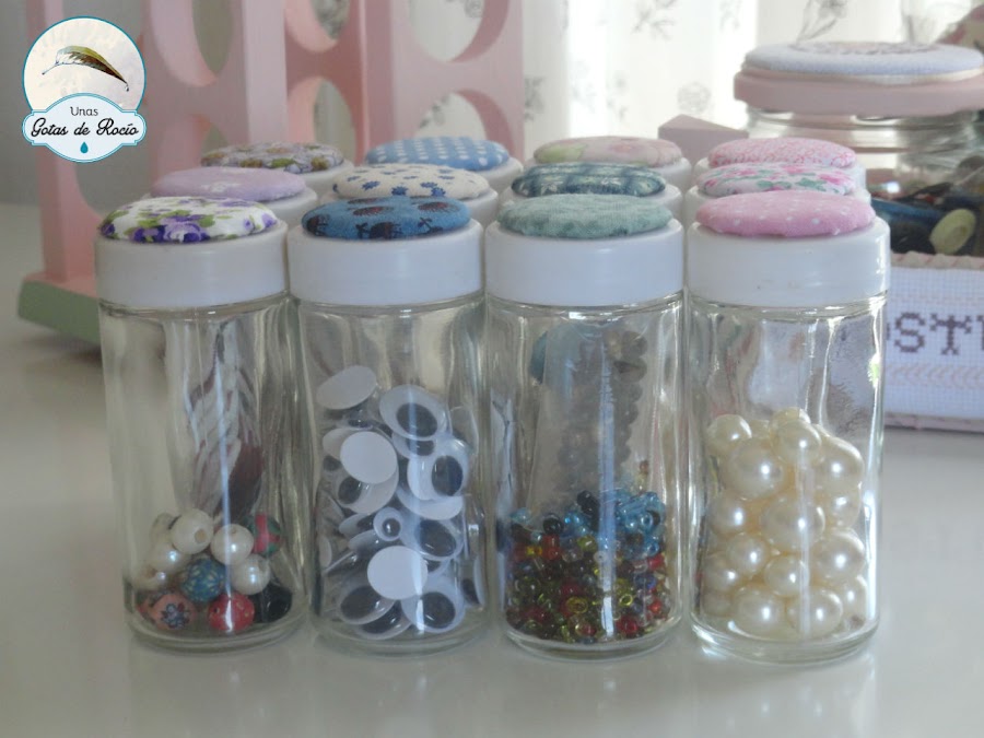 Mi nuevo clasificador ya está en uso en mi cuarto de costura, junto a otros botes de cristal que poco a poco voy reciclando, dándoles segundas oportunidades y a algunos incluso terceras.
