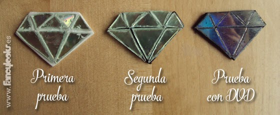 Os pongo aquí una muestra de tres pruebas fallidas que hice con CDs cortados a trozos y con un DVD, como veis, en un principio pretendía cortar un cachito por cada faceta del diamante pero eso no me daba buen resultado porque chafaba mucho el brillo. Los pegotes de pegamento también los evito ahora dejando hasta el final la lámina de plástico que uso para transferir el esquema del diamante, explicaré más adelante este tema: