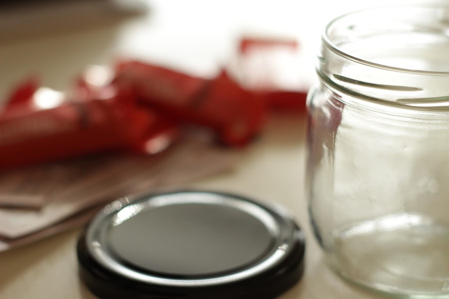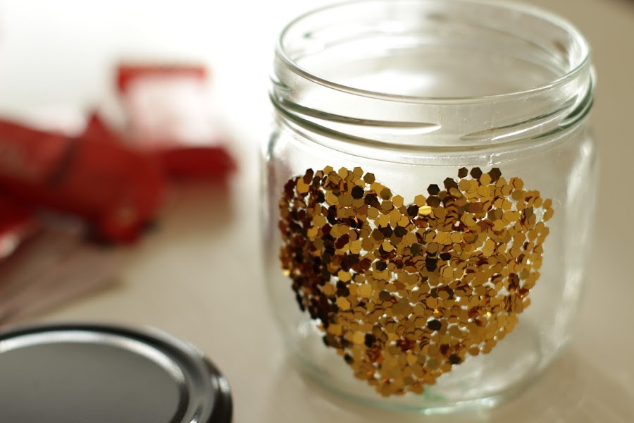 La inspiración me vino de Pinterest (como no...) y ya había visto en varias ocaciones ideas para regalar en un bote, como los ingredientes de un bizcocho, o un mini costurero. Así que llevaba tiempo queriendo regalar algo dentro de un bote. Y voilá! llegó San Valentín y la oportunidad de reciclar uno. Además, en Estados Unidos compré un bote de purpurina gigante que me moría por usar, pero aún no había encontrado la manualidad perfecta.