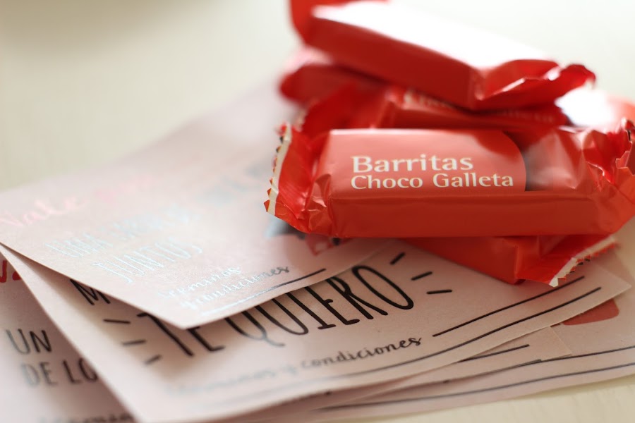 Yo he utilizado unas chocolatinas envueltas para que no se manche el resto de objetos (aunque también podéis hacer bombones caseros como hice yo hace dos años), los vales imprimibles y unas tiritas con corazones de Tiger. Si no sois muy de regalar en San Valentín siempre podéis cambiar el corazón por la silueta que queráis.