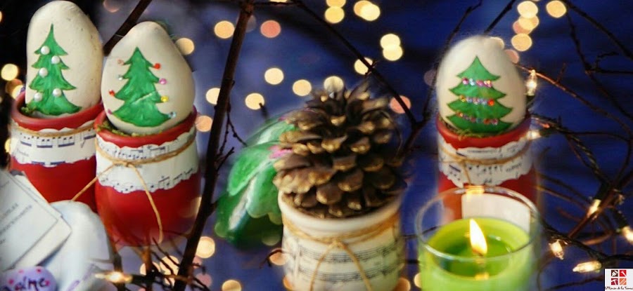 Las piedras las he pintado con acrílica, en un tono visón o veis, pero también las podéis dejar naturales, tal cual vienen, (previamente hay que limpiarlas) eso a vuestro gusto. Luego he dibujado el árbol de navidad en cada una de ellas y antes de decorar una mano de barniz para proteger. Por último los he decorado con perlitas adhesivas, de colores y de perlas