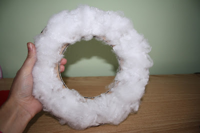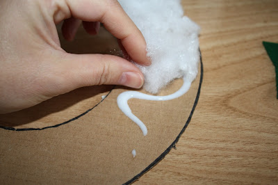 Después, pegamos la guata al cartón. Ha de quedar con volumen así que sed generosos. Si no tenéis guata, vale también pompones de algodón.