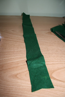 Posteriormente, cortamos cintas de fieltro de 5 centímetros de ancho aproximadamente. Al usar retales, tenía cintas de todos los tamaños, unas más largas y otras más cortas, pero esto tampoco va a tener mucha importancia.