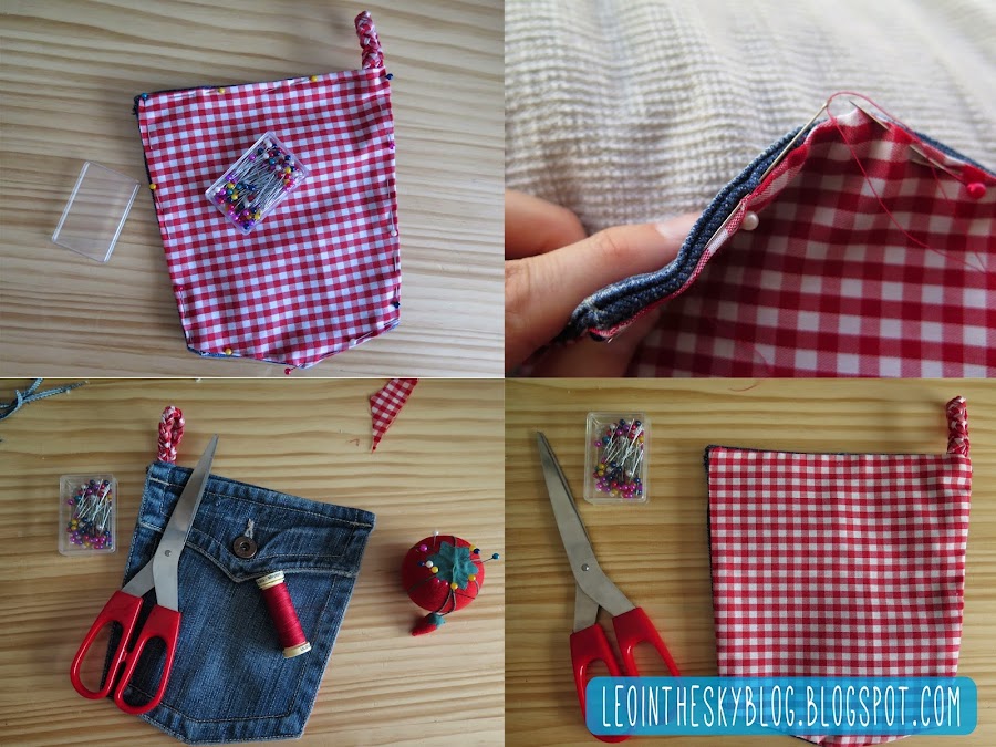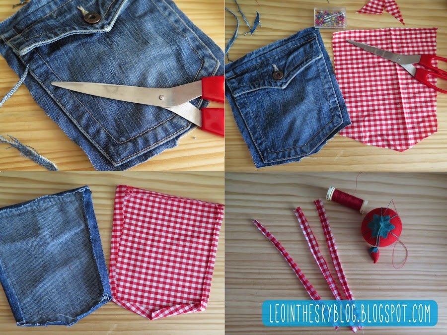 Lo primero que hice fue recortar el bolsillo dejando un margen alrededor de 1cm aproximadamente, bueno esto donde podía, porque estos vaqueros ya habían sido usados anteriormente para realizar la alfombra de trenzas vaqueras que os enseñé hace tiempo por aquí y en algunas zonas el margen es mínimo. Después se recorta un trozo de tela más o menos del mismo tamaño y se planchan los bordes hacia dentro como se ve en la imagen. A continuación cortamos tres tiras de tela que también doblaremos sobre sí mismas con la ayuda de la plancha para evitar en lo posible que se deshilache, aunque siempre podemos sustituirlas por un cordón o cinta que tengamos o no poner nada. A mí me gusta, porque así nuestra bolsita tiene una asita por la que podemos colgarla.