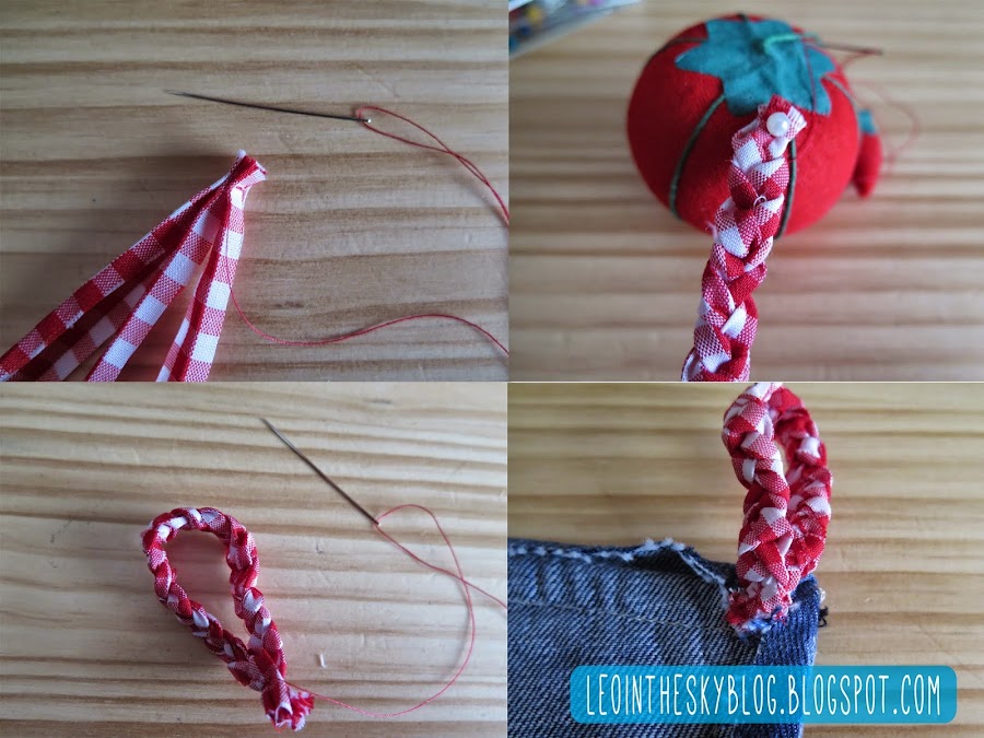 Juntamos las tres tiras con unas puntadas, pinchamos con un alfiler en un alfiletero y hacemos una trenza. Después formamos un aro y lo cosemos al bolsillo por la parte de atrás.
