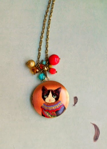 Medallón y cadena de metal color bronce envejecido con abalorios de cristal y cerámica.