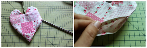 ? Sin llegar a la costura, hacemos pequeños cortes en las partes curvadas para que cuando le demos la vuelta el corazón quede plano.