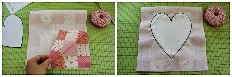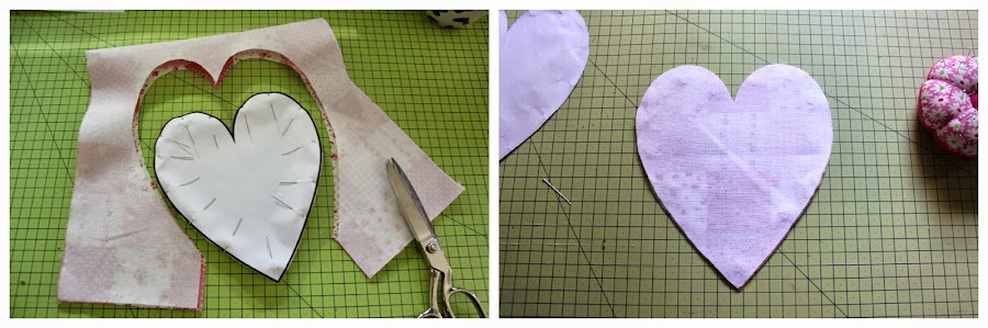 ? Colocamos el corazón (previamente cortado) encima de las telas y lo sujetamos todo con alfileres.