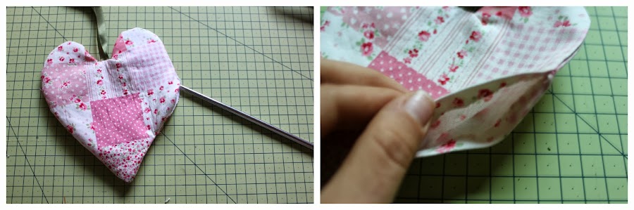 Truco: cuando llegamos a la parte que une ambas mitades (justo donde hemos colocado la cinta de raso por la mitad) cosemos en línea recta ya que si lo hacemos siguiendo la forma del corazón, el resultado final quedará abultado.