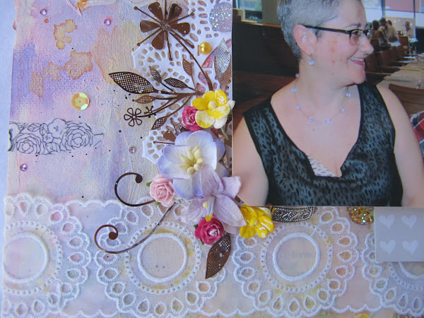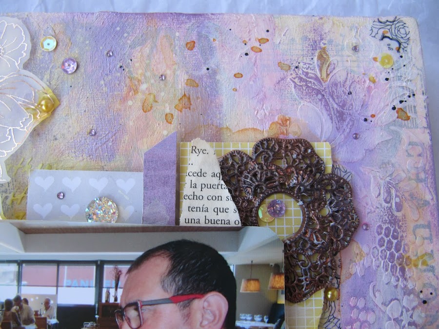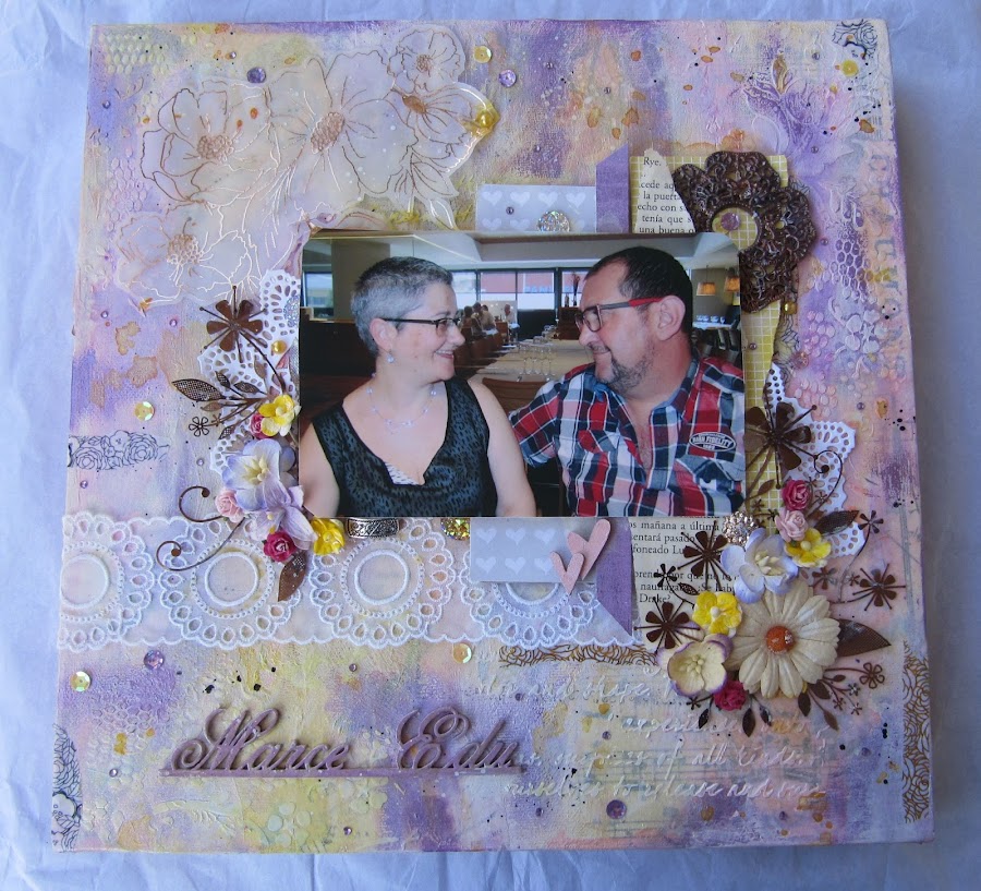 Los colores utilizados tienen mucho brillo, de distintas marcas el conjunto de ellas me da un resultado que me gusta con distintas texturas y tonos. Un par de mascaras y bastantes flores algunas de ellas de metal, las doradas en el papel de vellum, tengo que reconocer que me ha enamorado!!!