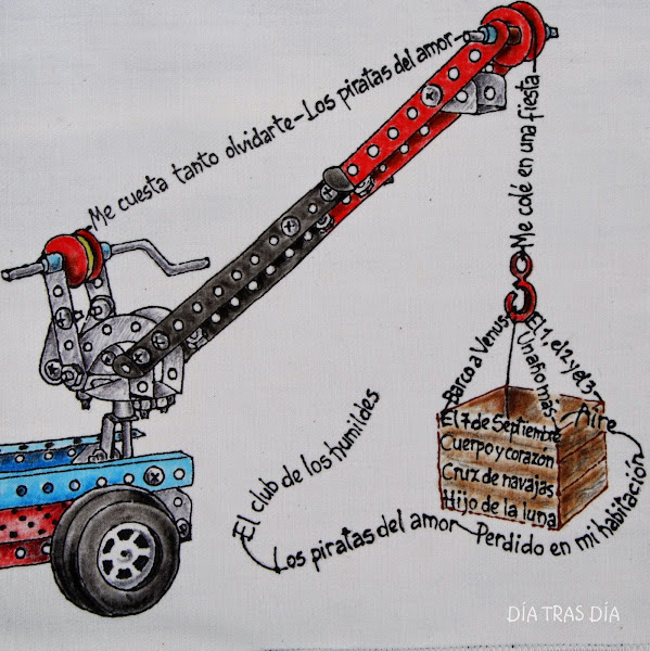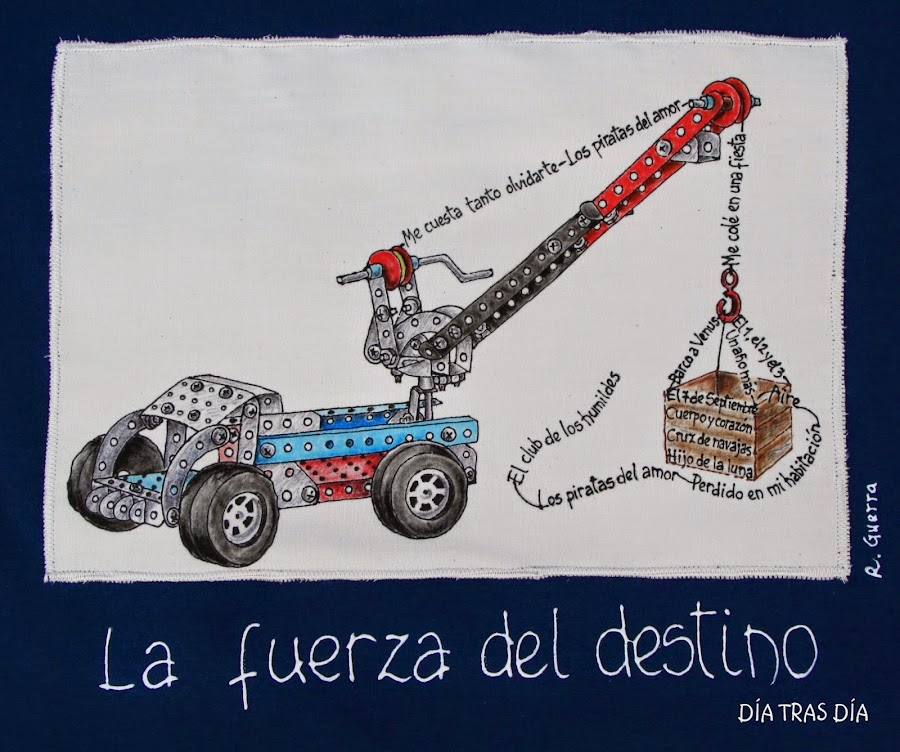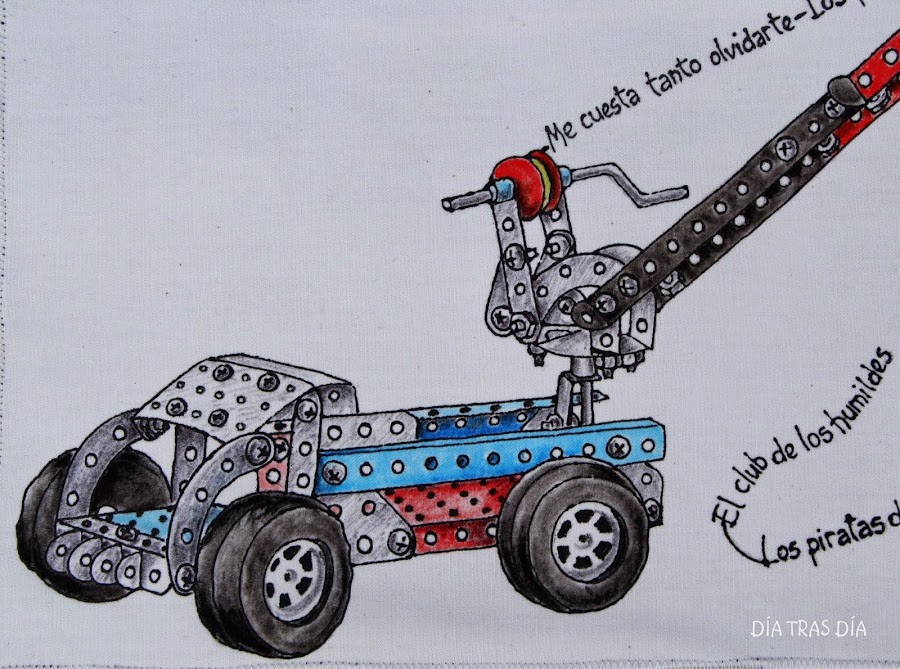 Pero se ve que Auxi se puso a darle al coco para conseguir una camiseta aún más original y me planteó que si era posible hacer que los títulos de las canciones quedasen integrados en un dibujo de un mecano, haciendo honor al nombre del grupo.