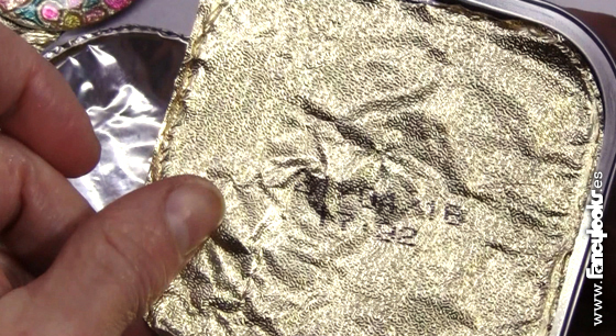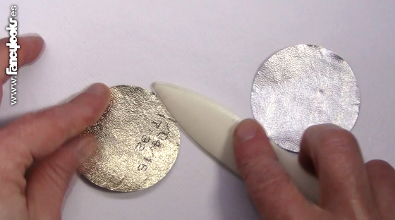 Coloco uno de los círculos con la parte dorada hacia arriba en un "embossing folder", o carpeta de relieve, de esas que se usan para scrapbooking con la Big Shot, máquina que en este caso no nos hace falta. Con la misma espátula de plegado o palito de helado le vamos frotando y apretando por toda la chapita de aluminio para que quede marcada con el relieve al máximo. Al ser aluminio marcará muy bien y fácilmente. Coloco el otro de los círculos en el "embossing folder" con el lado plateado para arriba y vuelvo a marcar con el palo.