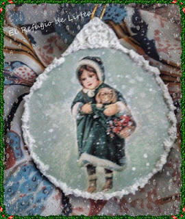 Aparte de los medallones de madera cortados por mi y de las imágenes impresas ( impresión en láser) he utilizado pinturas acrílicas, barniz mixtión, textura nieve, moldes de silicona, pasta flexible de secado al aire y barniz.