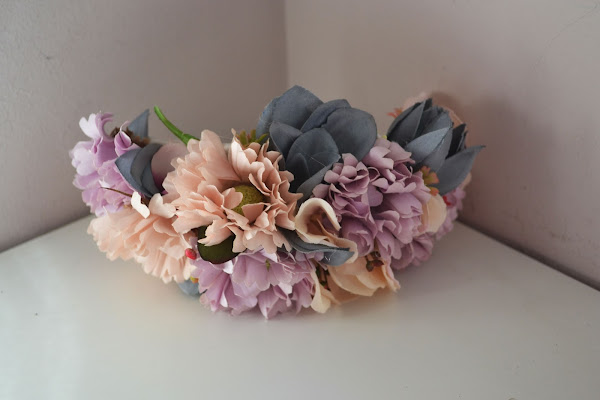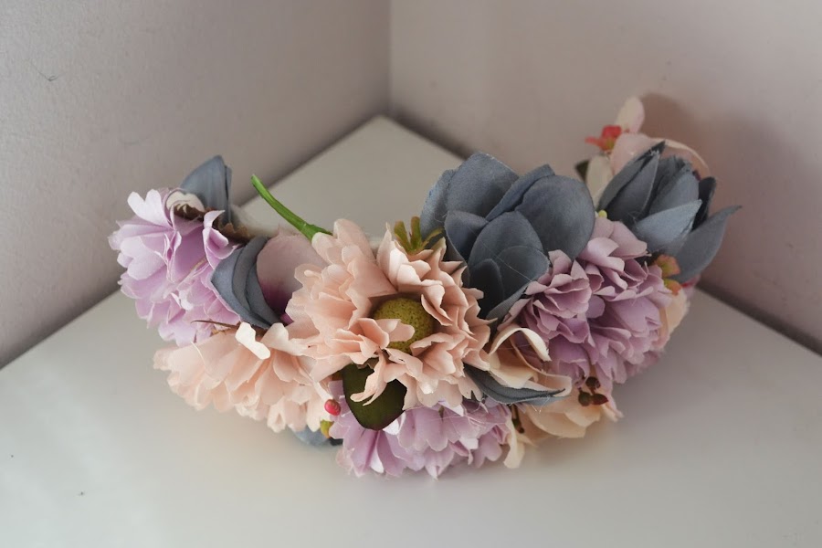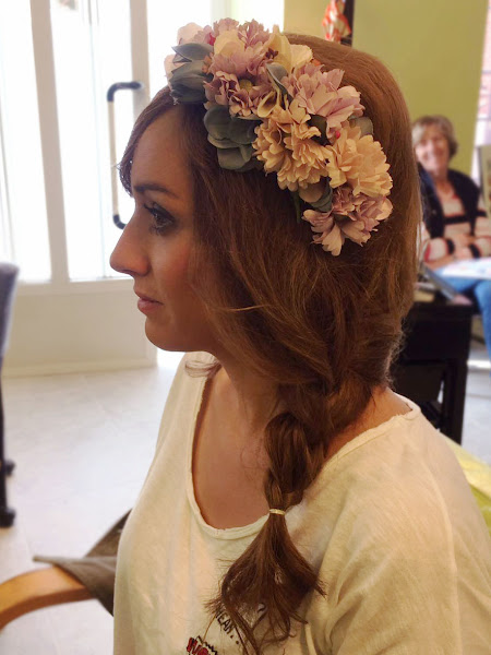 Le hice un tocado de media corona con flores en tonos viejos a juego con su vestido que se colocó en una trenza despeinada de medio lado.