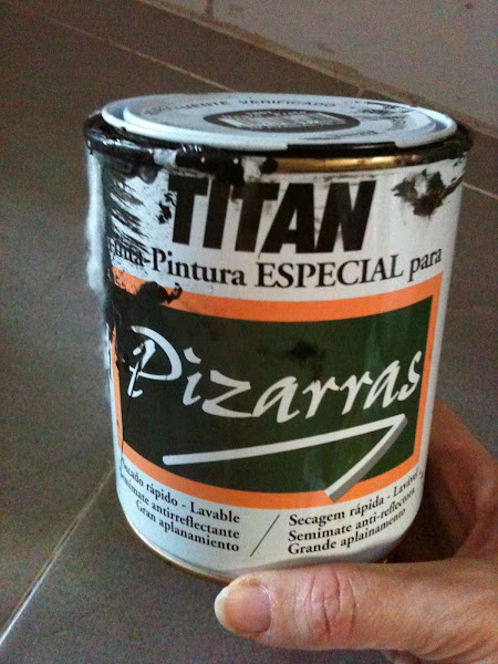 Si nunca habéis usado este tipo de pintura os animo a hacerlo.Se puede aplicar sobre cualquier superficie sin tratar previamente (solo debe estar bien limpia): papel, etiquetas adhesivas, azulejos, madera, metal, cristal... Yo la usé por primera vez hace dos años, cuando nos mudamos a la casa nueva y reciclé el armario de la tv de la anterior casa, en dos muebles, uno para cada dormitorio de mis soles. Se me ocurrió pintar una parte a modo de pizarra y no os cuento el uso que le dan.