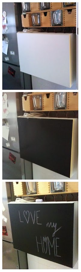 De hecho he aprovechado el frontal del escritorio que tengo en la cocina (donde guardo mis libros de recetas y mi portátil) y lo he pintado para convertirlo en pizarra también:
