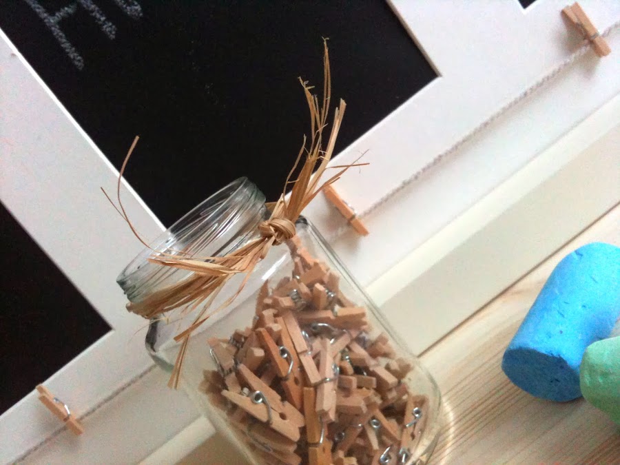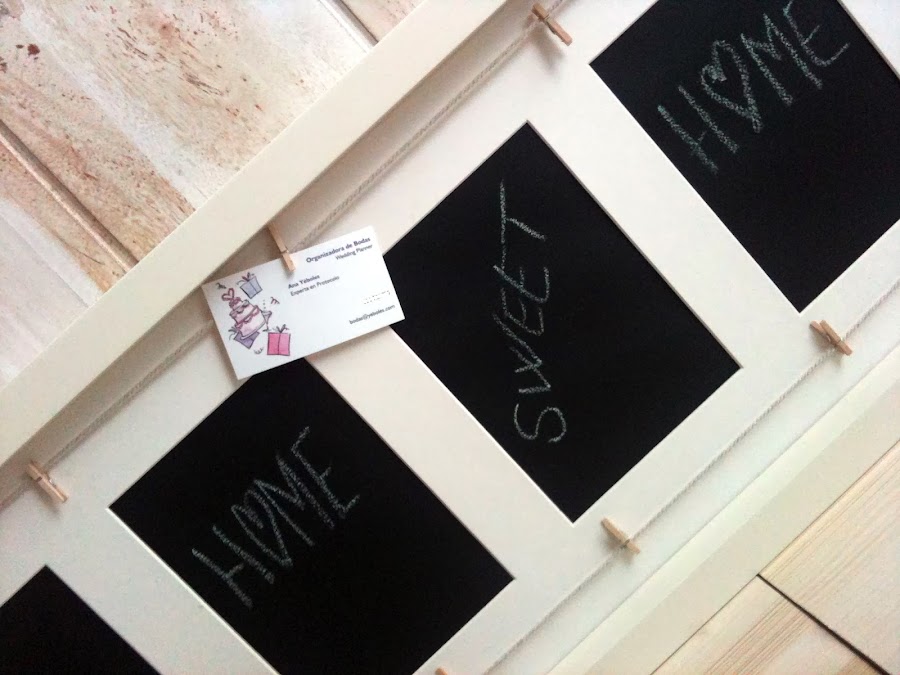 Bueno, que me enrollo :)) Una vez seca la pintura de la lámina, coloqué el paspartú y las cuerdas y pinzas que ya usé para el calendario y ¡tablero listo!