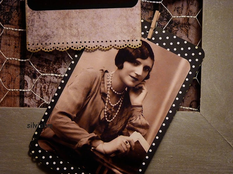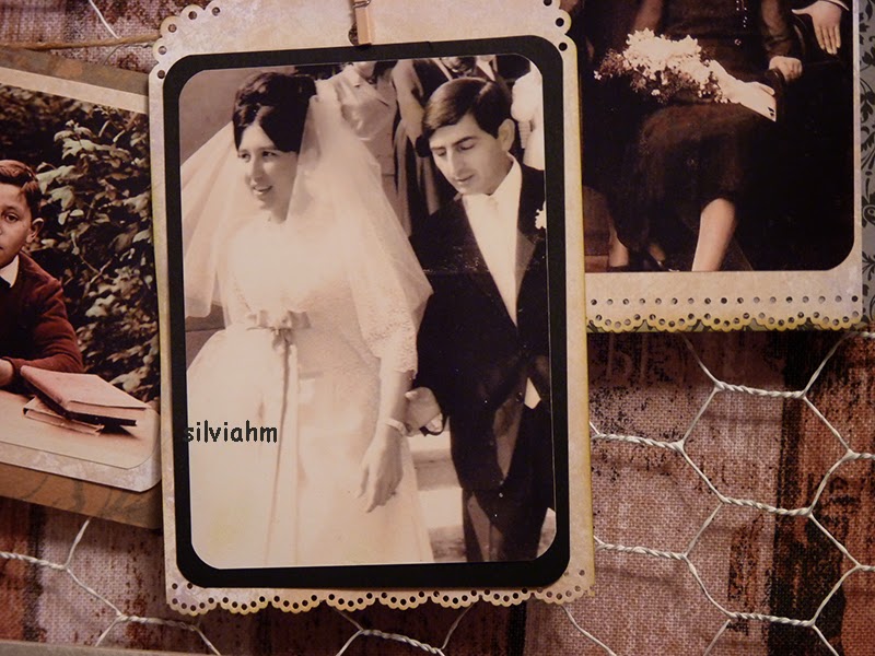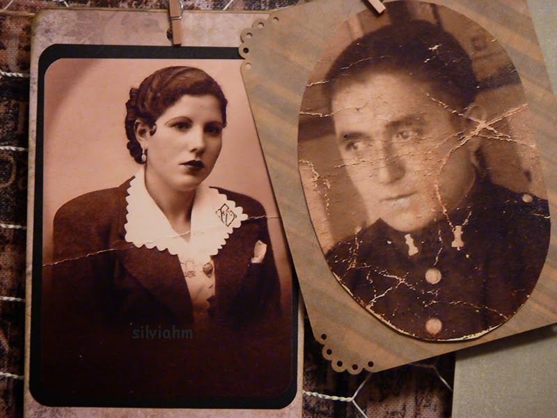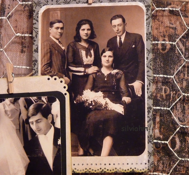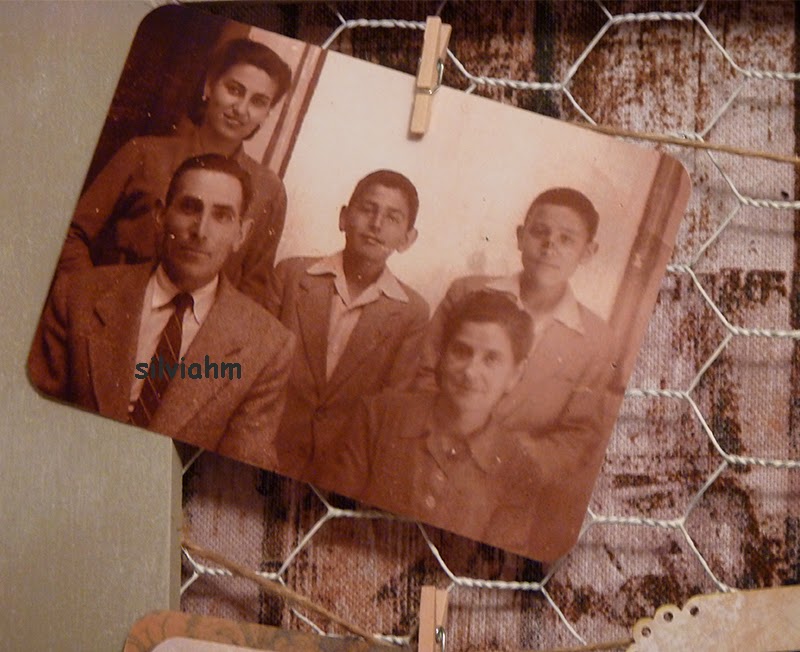 Esta es la palabra que he colocado en este marco. Se trata del mismo marco que utilizo para los espejos de las hadas (6o x 40), pero en esta ocasión con un aire totalmente distinto. Lo he pintado en color piedra y después, pátina blanca. Le he colocado tela de gallinero pintada en blanco y, como fondo, una tela de la que utilizo en las carpetas, con un diseño de tablas de madera desgastadas. Por último, he colocado una serie de fotos antiguas de mi familia, sujetas con pinzas a unas cuerdas. No me resisto a enseñaros algunas de estas fotos.