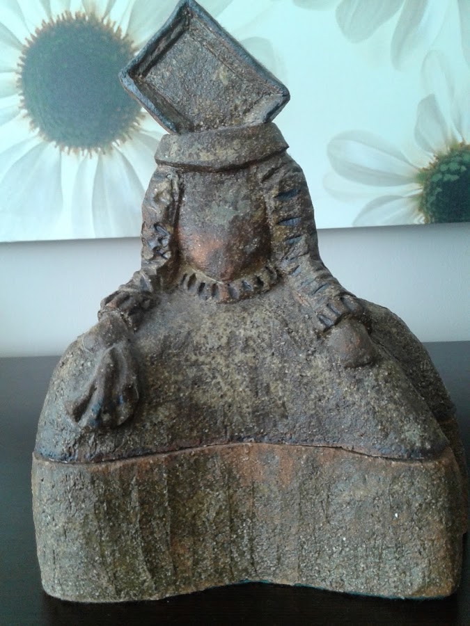 Esta realizado en barro refractario.Es mi visión personal de ahí que me gusto ponerle por cabeza un cuadro.