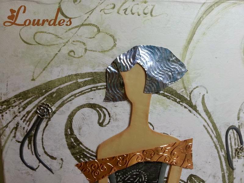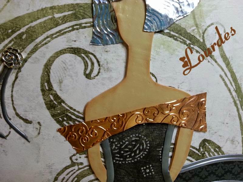 El pelo y el escote están realizadas con plancha de alumnio en color plateado y cobre