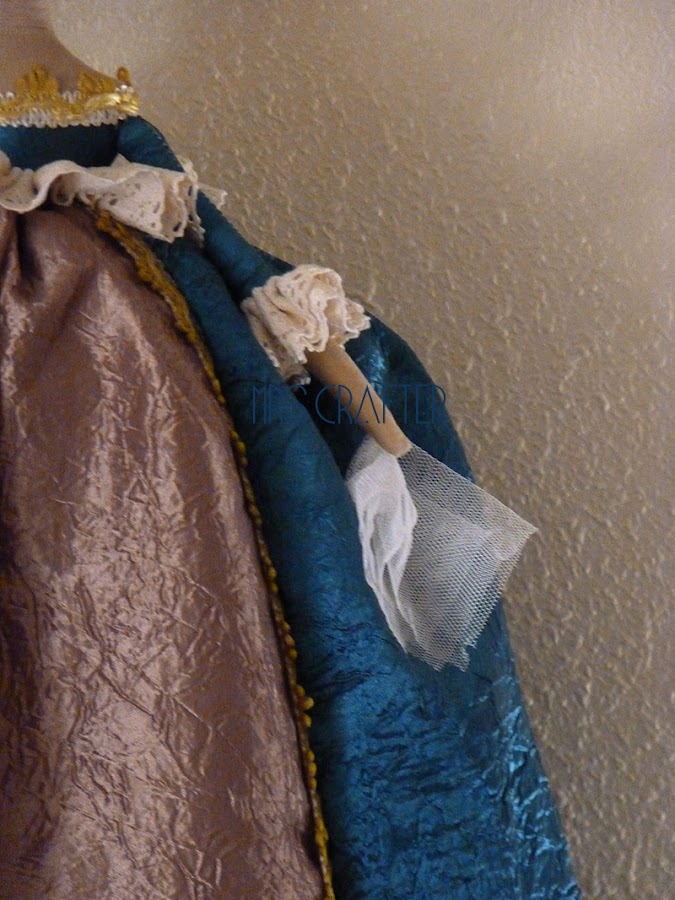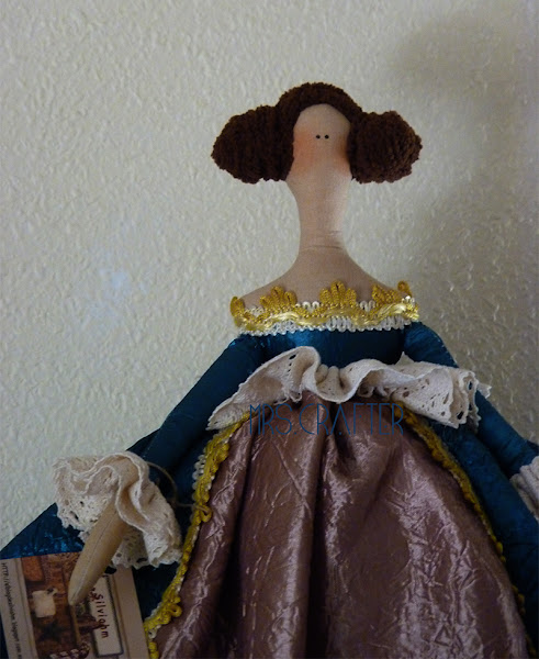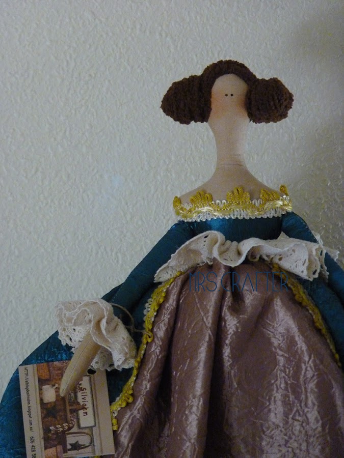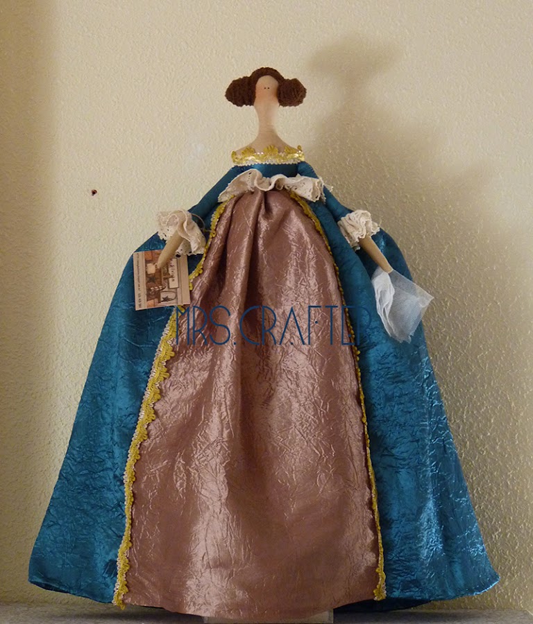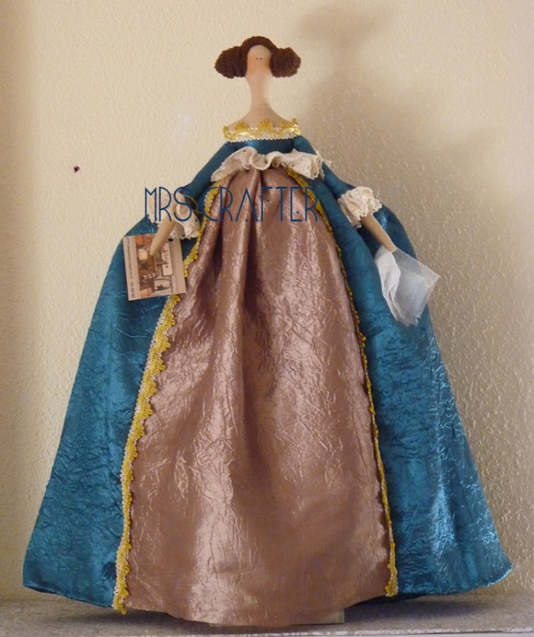 Seguro que a muchas de vosotras os pasa como a mí, hay una serie de muñecos o imágenes que os gustan por encima de otras.En mi caso, en trabajos country, siempre me voy a las ovejas, pero en muñecas, las matriuskas y las meninas me vuelven loca.Ambas las tengo en distintos formatos: Pintura, punto de cruz...las matriuskas, en tela y ahora también una menina.Tomando como base una muñeca Tilda, he creado ésta, muy, muy elegante. Brocados, sedas y remates varios.me ha costado cuadrar medidas hasta conseguir lo que quería( la he repetido tres veces), y finalmente he quedado satisfecha con esta versión.